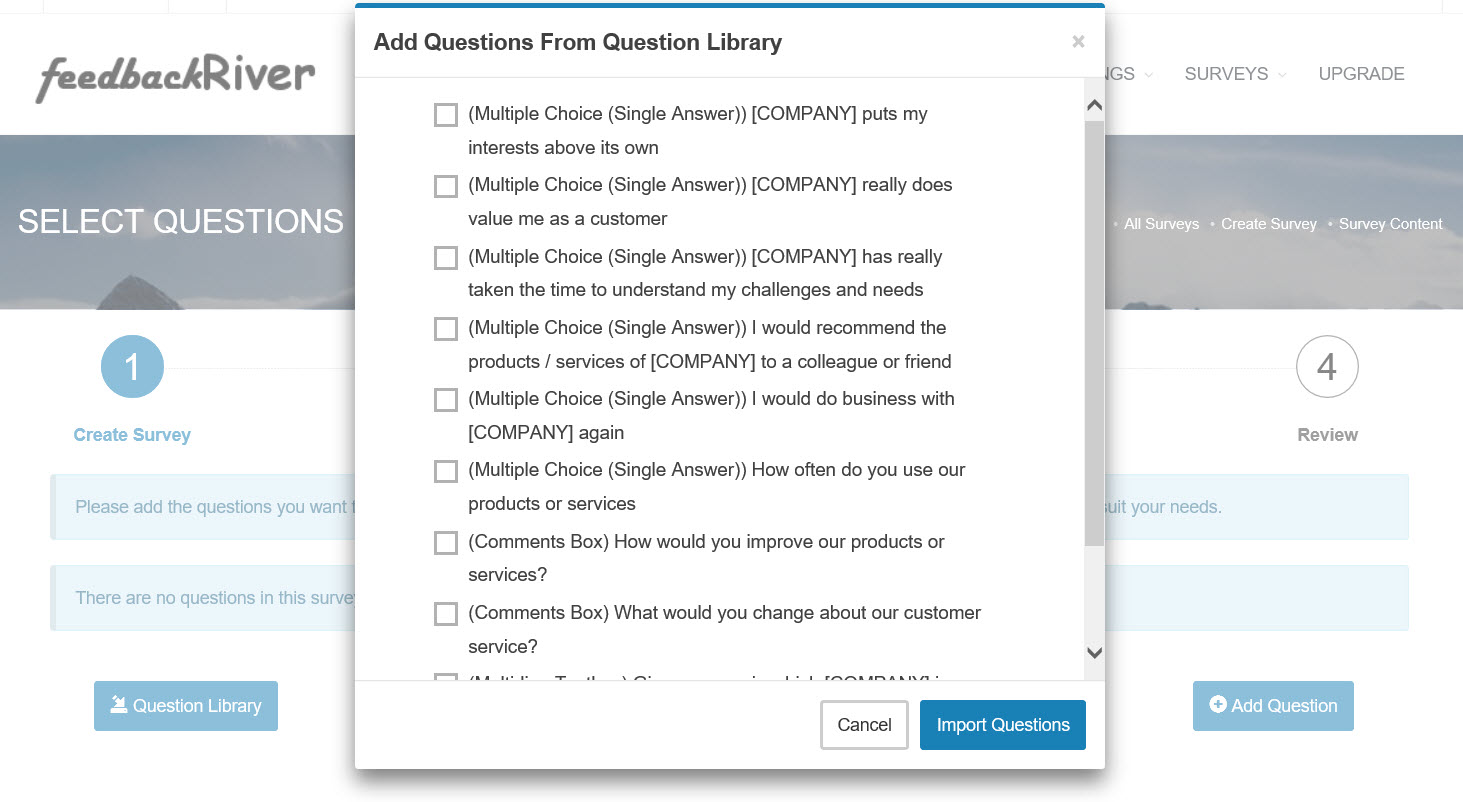 We have some excellent customer satisfaction questions available for free in our question library. You can also add your own questions.
