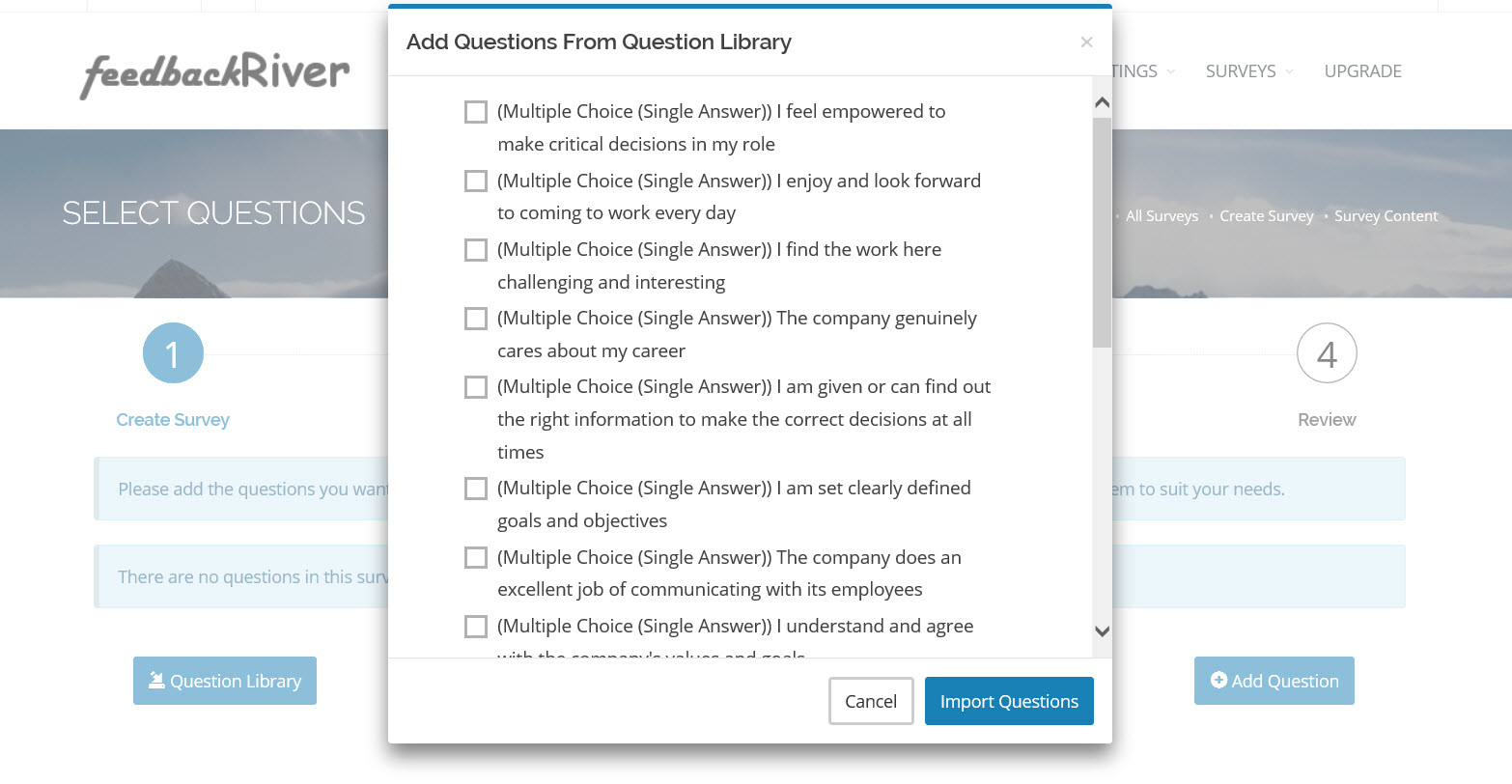 You can access our question library of common employee satisfaction surveys, add your own questions, or a mixture of both.